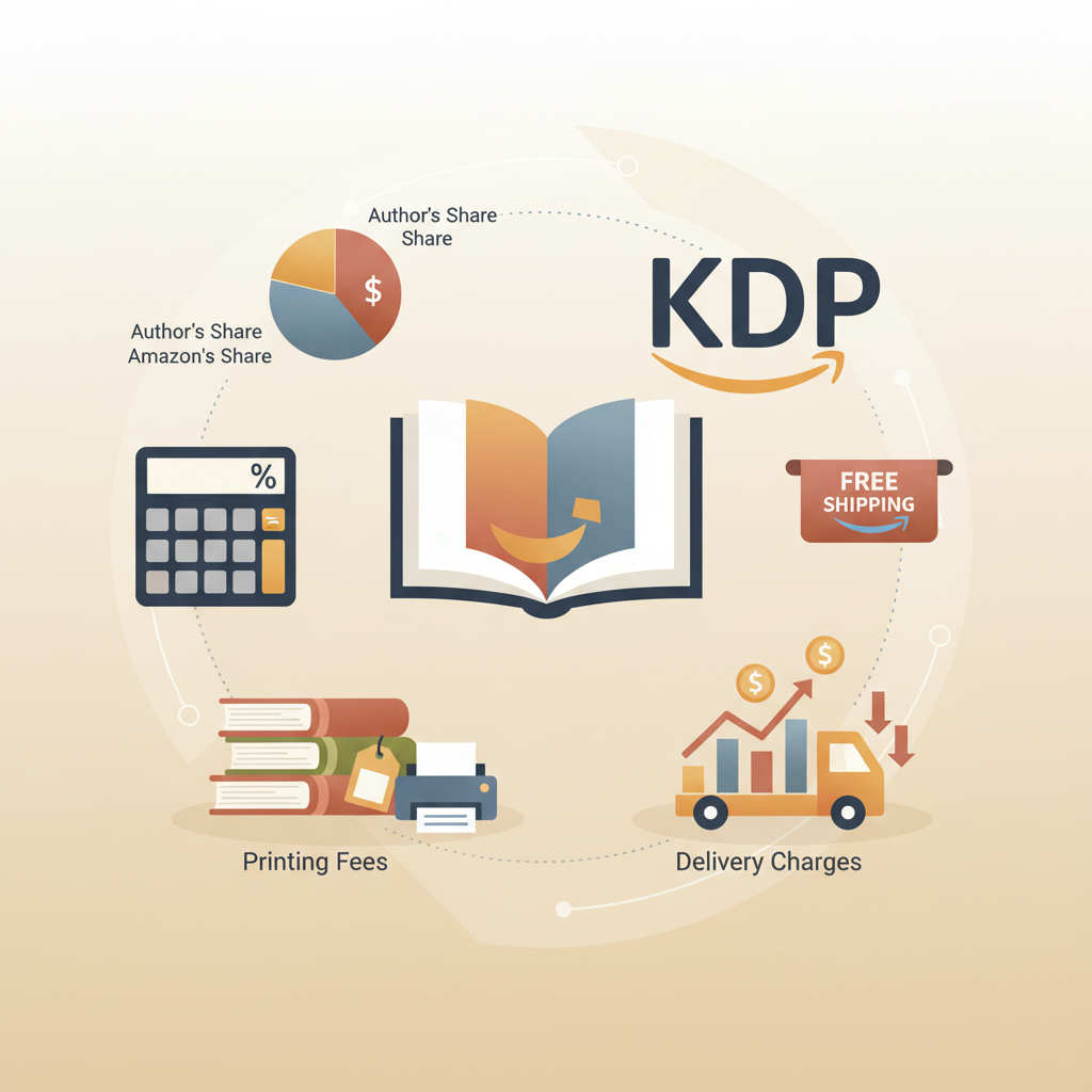 Per-sale costs: royalties are calculated after Amazon takes its share and any applicable fees (printing, delivery, distribution charges).