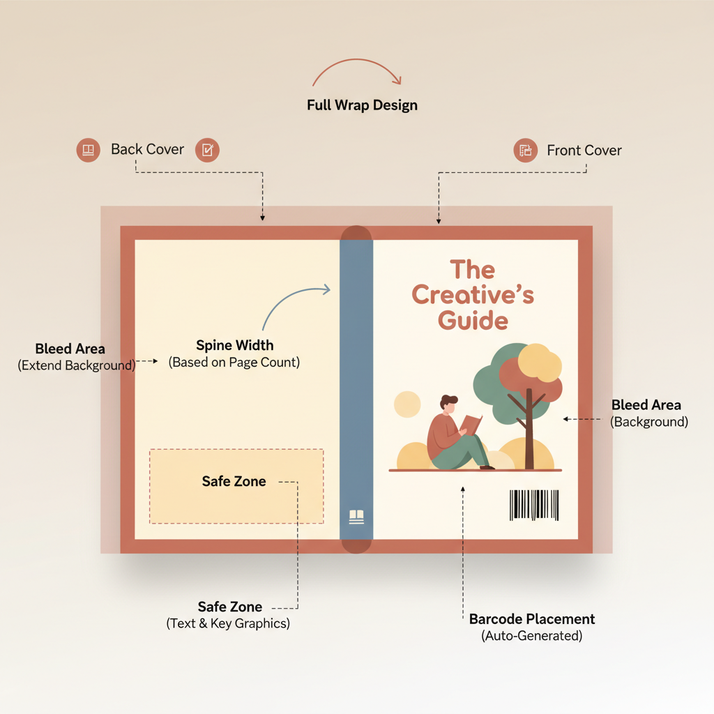 - Spine width, bleed, and safe zones